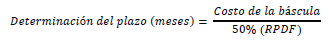 - Cálculo del plazo en el que se recaudarán los recursos para la ejecución del Plan de compra, instalación y puesta en operación de la báscula de pesaje, a partir de la siguiente fórmula: