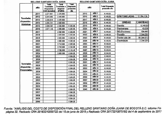 Fuente: Documento “Análisis del Costo de Disposición Final del Relleno Sanitario Doña Juana de Bogotá, D.C. Informe Final” remitido mediante Radicado CRA 2017-321-007519-2 del 4 de septiembre de 2017. Página 29”.