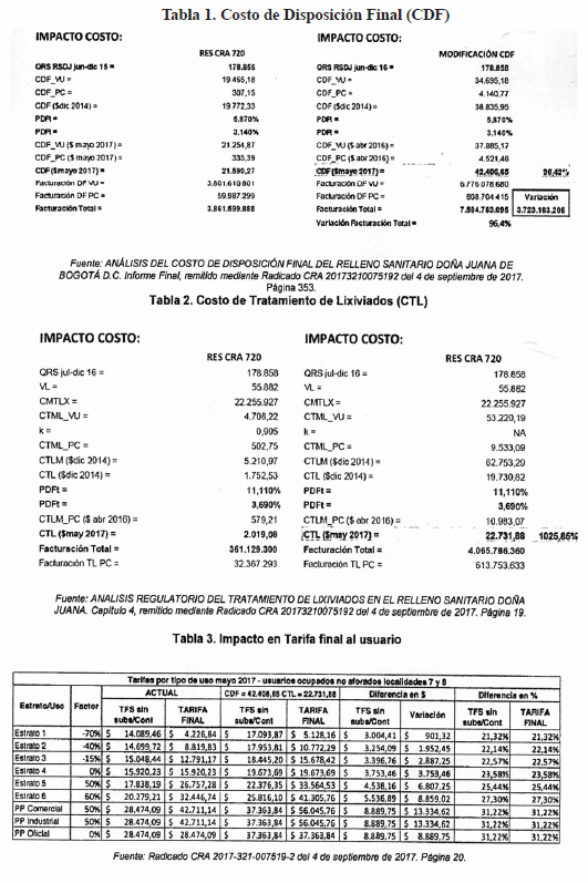 Que, por último, el solicitante asevera que “(...) los resultados de la modificación del Costo de Disposición Final (CDF) y del Costo de Tratamiento de Lixiviados (CTL) del Relleno Sanitario Doña Juana no desconocen los criterios orientadores del régimen tarifario mencionado”;