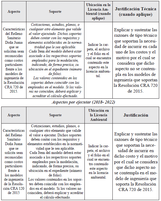 “(...) el Relleno Sanitario Doña Juana cuenta con particularidades de inversiones y operación determinadas por la Licencia Ambiental, Estudio de Impacto Ambiental, Plan de Manejo y normatividad de vertimientos, los cuales son descritos en los documentos y soportes que hacen parte de la presente solicitud, que difieren de los modelos establecidos por la CRA para la tecnología de referencia para el relleno sanitario tipo RSU 1 y el escenario 4 de tratamiento de lixiviados, y que deben ser reconocidas en los componentes de disposición final (CDF) y tratamiento de lixiviados (CTL) para garantizar el desarrollo de los proyectos de disposición final y tratamiento de lixiviados adelantados por CGR para de la adecuada disposición de los residuos del servicio público de aseo de Bogotá, D.C. y algunos municipios de Cundinamarca”(5).