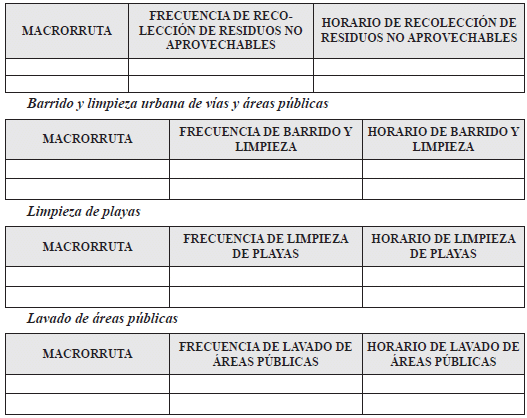 “Cláusula 27. Frecuencias y horarios para la prestación del servicio público de aseo para residuos no aprovechables en el APS declarada. La persona prestadora deberá diligenciar las siguientes tablas con la información de frecuencias y horarios en los que prestarán las diferentes actividades del servicio público de aseo, para cada una de las macrorrutas de recolección definidas en el APS declarada.
