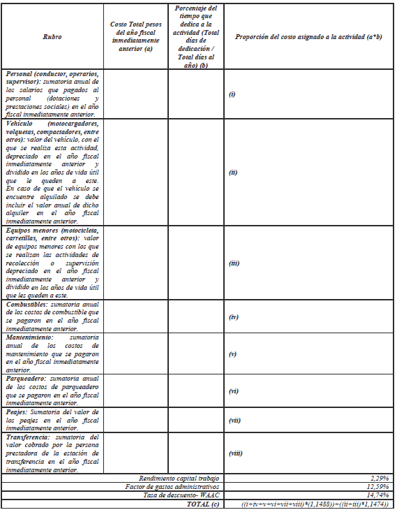 . Del mismo modo, en el cálculo del precio mínimo en el literal b, perteneciente al mismo artículo, se indica que el Costo de Barrido y Limpieza de vías y áreas públicas y Limpieza Urbana será el resultado de la aplicación de los rubros de la tabla; no obstante, en las últimas dos filas, se hace necesario ajustar la mención a la variable