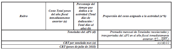 Costo de Recolección y Transporte de Residuos Sólidos definido en el artículo 115 de la presente resolución (pesos de julio de 2018/tonelada).