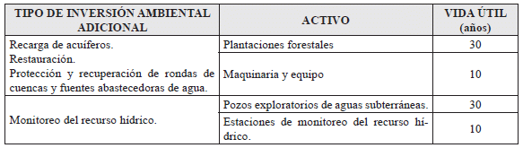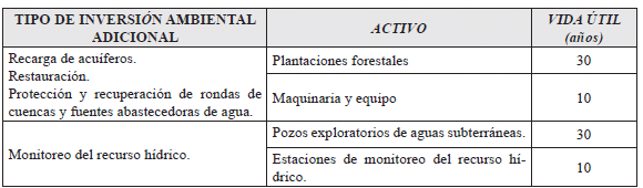 Artículo 31.G. Clasificación de activos por tipo de inversión ambiental adicional y asignación de su vida útil regulada. Los activos de las inversiones ambientales adicionales para la protección de cuencas y fuentes de agua corresponden a los descritos en la siguiente tabla y les corresponderá la siguiente vida útil regulada.