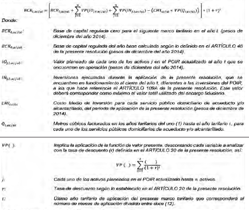 "ARTICULO 110. Base de capital regulada cero para el siguiente marco tarifario. La base de capital regulada cero para el siguiente marco tarifario, se determinará de acuerdo con la siguiente fórmula1