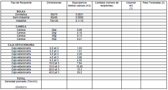 (2) En esta Columna debe incluir la suma de los pesos correspondientes a cada uno de los tipos de recipientes aforados.