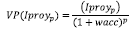 | FÓRMULA | Para el cálculo del indicador se aplicará la siguiente fórmula: Donde: IIAAC-.p:índice de Inversiones Acumuladas de Acueducto, redondeado a dos (2) cifras decimales. p: Año tarifario, en el que se prestó el servicio público domiciliario de acueducto, donde p = {1,2,3at}. Para el efecto del cálculo de este indicador se entenderá como año 1, el año en que se haya iniciado la ejecución del plan de inversiones proyectado por el prestador y at el período tarifario que finaliza en el período de evaluación del indicador. VPIejeCp. Valor presente de los recursos ejecutados en el plan de inversiones del servicio público domiciliario de acueducto en el período de evaluación p (expresado en pesos del año base). Corresponden a las erogaciones realizadas por el prestador sin discriminación del avance del proyecto y/o inversión, ya sea que la misma se encuentre "en curso' o "finalizada". Para el cálculo de esta variable se aplicará la siguiente fórmula: Donde; lejecp: Recursos ejecutados del plan de inversiones con el que calculó las tarifas del servicio público domiciliario de acueducto en el período de evaluación p, expresadas en pesos del año base de la metodología tarifaria vigente. Para lo cual deberá emplear el índice de Predos al Consumidor - IPC, publicado y calculado por el Departamento Administrativo Nadonal de Estadísticas (DANE). wacc: Tasa del costo promedio ponderado de capital regulatorio, de acuerdo con el marco tarifario que le aplique a la persona prestadora. VPIproyp: Valor presente de las inversiones proyectadas del plan de inversiones del servicio público domiciliario de acueducto desde el período de evaluadón (expresado en pesos del año base). Para el cálculo de esta variable se aplicará la siguiente fórmula: Donde: lproyp: Inversiones proyectadas del plan de Inversiones con el que calculó las tarifas del servido público domiciliario de acueducto, para el período de evaluación p, expresadas en pesos del año base de la metodología tarifaria vigente. Para la aplicación de esta fórmula se debe tener en cuenta los siguientes aspectos: - Se debe utilizar el POIR actualizado de que trata el parágrafo 1 del artículo 109 de la Resolución CRA 688 de 2014, modificado por el artículo 1o de la Resolución CRA 938 de 2020(1). - En el caso que el prestador cuente con recursos ejecutados en Inversiones compartidas entre Áreas de Prestadón del Servicio - APS, se aplicará la distribución de dichos recursos por APS aplicando los mismos criterios que el prestador consideró en la elaboración del plan de inversiones o POIR. Si no se realizó dicha distribución, la distribución de los recursos ejecutados y proyectados se realizará a partir del número de suscriptores atendidos por el prestador en cada APS benefidada en el último período de facturación del año tarifario. - SI la persona prestadora ha proyectado un plan de Inversiones y no ha reportado ejecudón de recursos, el Indicador será calificado como cero (0). - El indicador es aplicable a prestadores que empleen una fórmula tarifaria contractual en los términos del parágrafo 1 del artículo 87 de la Ley 142 de 1994, lo anterior, de acuerdo con el alcance de lo previsto en el contrato. Para el caso en que no se especifique un WACC en el contrato, se empleará el WACC regulatorio para el cálculo del indicador de estos prestadores. |