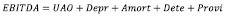 | FORMULA | Para el cálculo del Indicador se aplicara la siguiente fórmula: Donde. EBITDA: Beneficio antes de intereses, impuestos, depreciaciones y amortizaciones, redondeado a dos (2) cifras decimales. UAO: Utilidad de actividades ordinarias; es el valor contable que mide el resultado obtenido directamente relacionado con la operación de la persona prestadora. Se obtiene restándole a la Ganancia bruta los gastos de administración. Depr: Depreciaciones, mecanismo mediante el cual se reconoce el desgaste y pérdida de valor que sufre un activo fijo por el uso del mismo en la generación de ingresos a través del tiempo. Amort: Amortizaciones; distribución del costo de una Inversión como gasto a lo largo de los períodos en que esa inversión va a permitir obtener ingresos. Dete: Deterioro; valor que se genera cuando el valor en libros de un activo es superior al valorrecuperable. Provi: Provisiones; recursos que conserva el prestador por haber contraído una obligación, con el objetivo de guardar esos recursos hasta el momento en el que deba satisfacer la factura, se excluye la renta. |