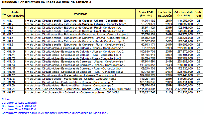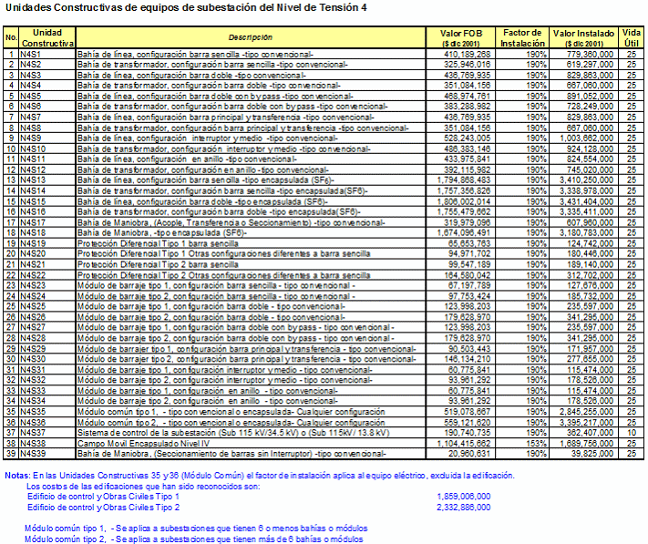 CMET4: Cargo Máximo Eficiente Transformado para activos diferentes a líneas radiales en el Nivel de Tensión 4 ($/kWh colombianos del mes de diciembre de 2001).