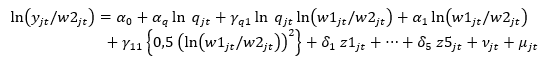 | Logaritmo natural del cociente de la división de la longitud total de redes del OR j, expresada en kilómetros, entre el número de usuarios, para el año t. | |