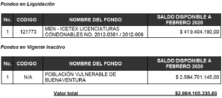 Que conforme lo dispuesto en el parágrafo 1 del artículo 1o del Acuerdo número 018 del 31 de marzo de 2020, “por el cual se reglamenta la incorporación al presupuesto del Icetex de los recursos de que trata el artículo 1o del Decreto Legislativo número 467 del 23 de marzo de 2020”, mediante el cual la Junta Directiva del Icetex facultó al Presidente del Icetex “…para que expida los correspondientes actos de incorporación al presupuesto de la entidad de los recursos de que trata el artículo 1o del Decreto Legislativo número 467 del 23 de marzo de 2020, constituidos por entidades de gobierno nacional y entes territoriales, que se van generando..” se expidió la Resolución número 651 del 25 de agosto de 2020, “por la cual se ordena la incorporación de recursos de unos fondos en administración en cumplimiento de los Decretos Legislativos 467 y 662 de 2020”, en la que se incluyeron los recursos provenientes del Fondo MEN–Icetex Licenciaturas Condonables números 2012-0381/2012-906, en liquidación, y la línea de crédito de pregrado para la Población Vulnerable de Buenaventura, creada mediante el Acuerdo número 012 del 1 de abril de 2014, con saldo disponible no comprometido en convocatorias actuales o futuras, y con saldo total disponible por valor de DOS MIL NOVECIENTOS OCHENTA Y CUATRO MILLONES CIENTO CINCO MIL TRESCIENTOS TREINTA Y CINCO PESOS ($2.984.105.335) M/cte., de acuerdo con el memorando número 2020003662-I del 10 de agosto de 2020 emitido por el Vicepresidente de Crédito y Cobranza, con el siguiente detalle: