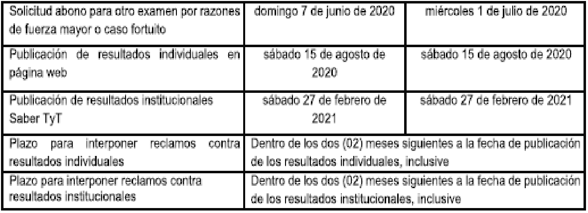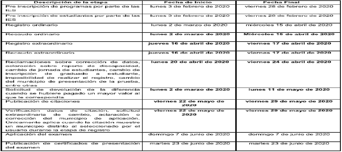 Que con el fin de que el examen de Estado pueda cumplir su objetivo de evaluar la calidad de la educación, se requiere aumentar el plazo de Inscripción y otras actividades correlativas que faciliten a las personas culminar estas etapas dentro de plazos razonables con la emergencia sanitaria. Para ello, se modificará el cronograma del examen Saber TyT primer semestre 2020 en el sentido de ampliar las fechas de las etapas de inscripción y recaudo, sin modificar la fecha de aplicación de la prueba. Que, en mérito de lo expuesto,