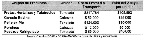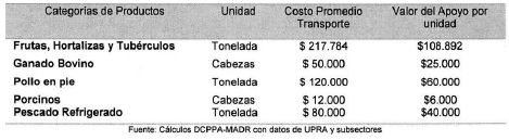 - Dada la coyuntura y los efectos económicos generados por cuenta de la pandemia del COVID-19, las Direcciones técnicas de cadenas productivas consideran pertinente un apoyo del 50% del valor costo promedio ponderado nacional del transporte de carga para cada uno de los grupos objeto de la resolución, en virtud de las alteraciones en la comercialización de productos perecederos de origen agropecuario, con lo cual, se espera contribuir a la reducción de los efectos económicos adversos por tal situación.