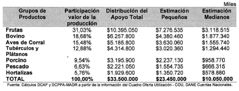 - Con base a lo anterior se definen los grupos de productos objeto del apoyo son: frutas, hortalizas y tubérculos, ganado bovino, pollo en pie, ganado porcino y pescado refrigerado.