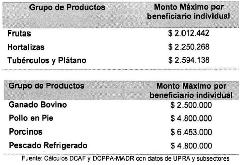 PARÁGRAFO 2o. Para el caso de los productos que se acojan a la excepción descrita en el parágrafo del artículo 2o, el monto máximo por beneficiario individual, corresponderá al promedio simple entre las categorías de productos agrícolas, objeto del apoyo, el cual es de $2.285.616.