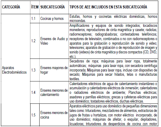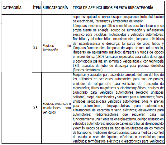 1. El conjunto de AEE relacionado en la tabla es provisional. Debe ser empleado como referencia en tanto Minambiente define oficialmente la lista de AEE para efectos de la gestión de sus residuos.
