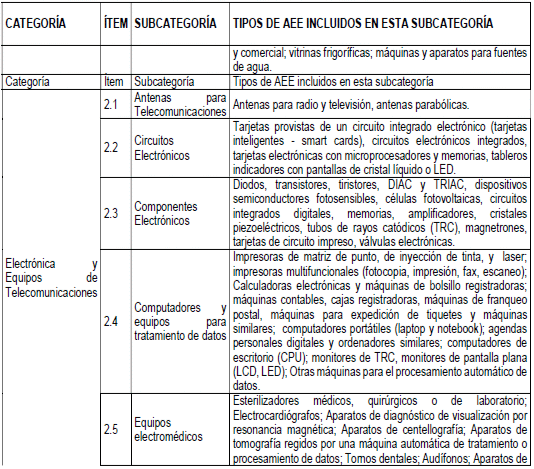 CATEGORIZACIÓN DE LOS APARATOS ELÉCTRICOS Y ELECTRÓNICOS PARA EFECTOS DE LA GESTIÓN DE SUS RESIDUOS.