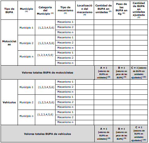 (1) Esta tabla se debe presentar por cada tipo de BUPA introducida o puesta en el mercado (motocicleta o vehículo).