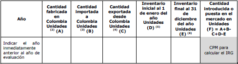 (2) La cantidad en unidades (A) deberá corresponder al valor total de la cantidad fabricada en unidades en Colombia (casilla K de la Tabla 2C).