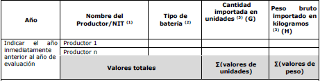 (3) Las cantidades (G) y (H) son anuales y totalizadas en el periodo comprendido del 1 de enero al 31 diciembre; esta información deberá coincidir con aquella reportada en las respectivas declaraciones de importación de las baterías plomo ácido, según las casillas de cantidad y de peso bruto. La ANLA podrá requerir la presentación de dichas declaraciones, en el evento que haya información que no pueda obtener de las fuentes y bases de datos oficiales; lo anterior con el fin de validar la información reportada.