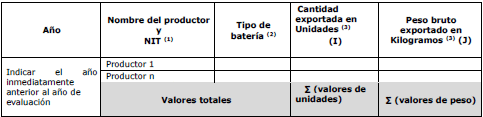 (3) Las cantidades (I) e (J) son anuales y totalizadas en el periodo comprendido del 1 de enero al 31 de diciembre; esta información deberá coincidir con aquella reportada en las respectivas declaraciones de exportación de las baterías plomo ácido, según las casillas de cantidad y de peso bruto. La ANLA podrá requerir la presentación de dichas declaraciones, en el evento que haya información que no pueda obtener de las fuentes y bases de datos oficiales, lo anterior con el fin de validar la información reportada.