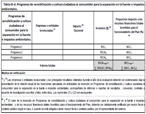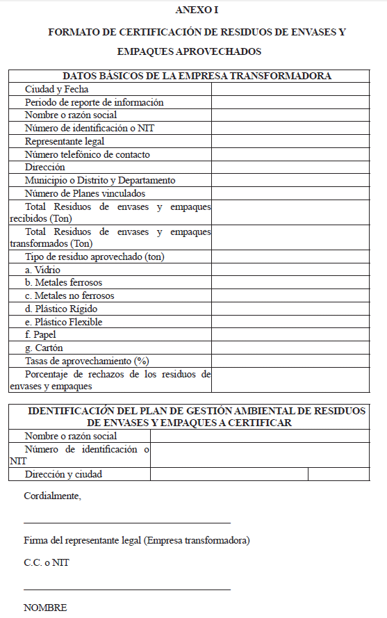 d) Expedir certificación a los planes de gestión ambiental de residuos de envases y empaques presentados a la ANLA, que incluya la información contenida en el formato del Anexo I “Formato de certificación de residuos de envases y empaques aprovechados” que forma parte de la presente resolución;