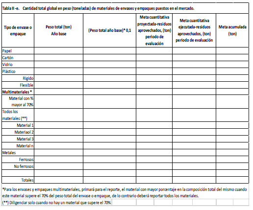 E) Línea base en toneladas de todos los envases y empaques y productos plásticos de un solo uso puestos en el mercado en el año base, con excepción de aquellos que tienen metas específicas en la Ley 2232/22, identificando el tipo de resina según la tabla 1.