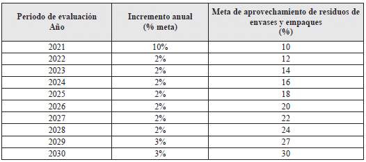 Tabla. 1 Metas de aprovechamiento de residuos de envases y empaques en porcentaje