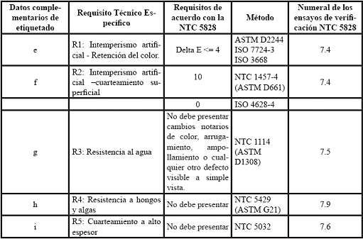 Además demostrar el cumplimiento de la totalidad de requisitos técnicos específicos para las pinturas de uso exterior de alta resistencia, con los respectivos ensayos de los numerales establecidos en la NTC 5828 del 15 de diciembre de 2010, de acuerdo con la Tabla No 2.