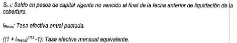 a) El monto en pesos, resultante de aplicar el equivalente mensual de la tasa de interés pactada en el crédito al saldo de capital vigente no vencido al momento de la liquidación anterior de la cobertura;