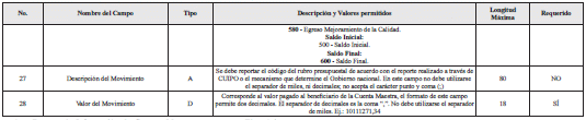 | 25 | Tipo de registro de movimiento | N | Los valores permitidos son: Ingresos: 100 - Ingresos 110 - Rendimientos Financieros 120 - Reintegros Bancarios por rechazo de operaciones Egresos: 800 - Egresos Permitidos 360 - Egresos por costos o gastos bancarios, cuando haya lugar, en este caso el beneficiario es el mismo banco 500 - Saldo Inicial 600 - Saldo Final | 3 | SÍ |