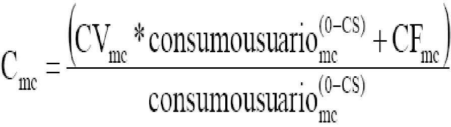 | Cmc: | corresponde al Costo de Prestación del Servicio en pesos por kilowatio hora o en pesos por metro cúbico, según corresponda, para el mes de cálculo mc. | |
