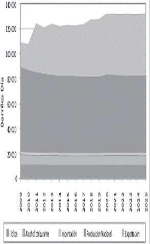 El gráfico muestra las proyecciones de biodiésel en una mezcla de 5%. Durante 2009 se demandan 5,411 barriles día de Biodiésel y en 2025 se requerirán 8,400 barriles por día, es decir un incremento del 55.1%.