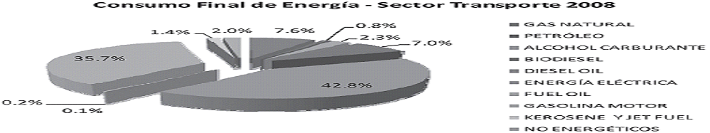 El sector Transporte es el de mayor consumo de combustibles fósiles con el 81% de participación. El gas natural y los biocombustibles participan solo con el 17%. La energía eléctrica es la consumida por el Metro de la ciudad de Medellín. El gráfico siguiente muestra el consumo final de energía por energético en este sector.