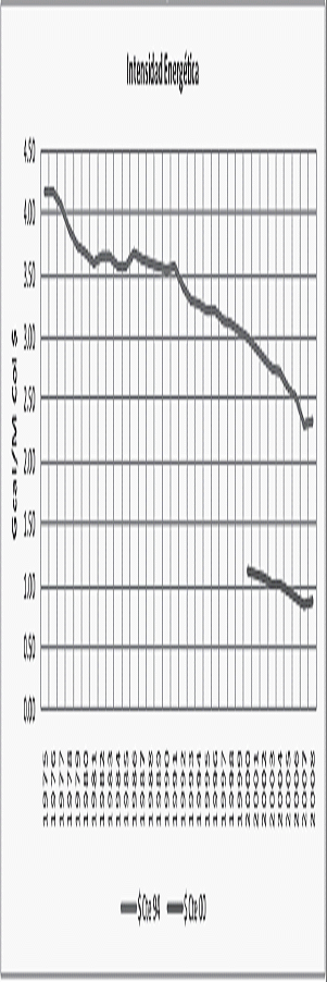El gráfico siguiente muestra la evolución de la intensidad energética del sector transporte tanto en PIB con pesos de 1994 como en PIB con pesos de 2000. Se muestra una tendencia a la baja de este indicador de eficiencia. La intensidad energética del sector transporte es la de mayor valor en comparación con la de los otros sectores y del global nacional, ya que este sector es el mayor consumidor de energéticos, principalmente los derivados del petróleo y el PIB relacionado con este sector es uno de los más bajos del país.