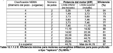 (…) e) Para motores sumergibles trifásicos para pozo profundo o tipo “lapicero”, los valores serán los que aplique de la tabla 12.1.1.2 E. (...)