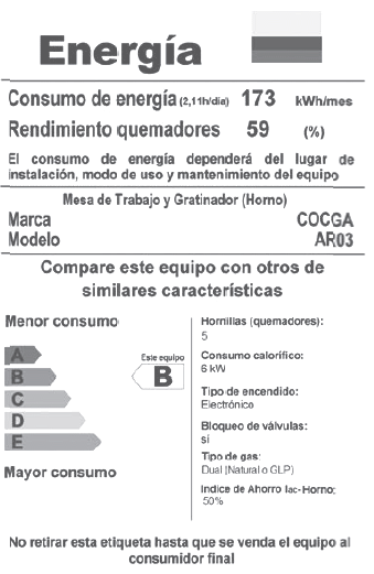 En el caso de equipos que integren mesa de trabajo y horno se deberá exhibir una etiqueta para la mesa de trabajo y otra para el horno o gratinador. Podrá excepcionalmente usarse una sola etiqueta siempre y cuando la denominación declarada sea “Mesa de trabajo y Gratinador (Horno)”, así como incluir, dentro del espacio para información comparable, el Índice de Ahorro - Iac, en consumo del horno.