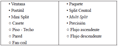 “ACONDICIONADOR DE AIRE PARA RECINTOS: Para efectos del presente reglamento se deberá entender como todo ensamble o ensambles cerrados, designados como unidad, para instalar sobre una ventana, a través de una pared o como consola que presta el servicio de acondicionamiento de aire, el cual se alimenta de electricidad y dispone de un sistema condensador enfriado por aire. Se diseña principalmente para disponer de un caudal libre de aire acondicionado a través de una o más salidas a un espacio, habitación o zona cerrada (espacio acondicionado) de manera controlada. Incluye medios para des-humectación, circulación y purificación, así como opcionalmente para ventilación, humectación y calefacción. Cuando el equipo se suministra en más de un ensamble (sistemas separados), los mismos están diseñados para usarse en conjunto.