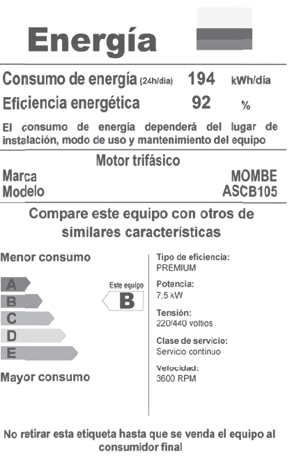 - Motores: No hay muestreo, cada equipo, deberá disponer de la información soporte, para el consumo y desempeño energético, etiquetada o a etiquetar, obtenida bajo responsabilidad del productor con base en resultados de ensayo a los modelos base y/o resultados de herramientas de diseño/simulación, propias del fabricante, el productor o de terceros.