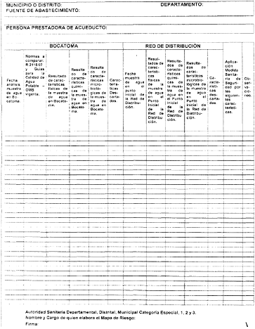 ARTÍCULO 2o. CAMPO DE APLICACIÓN. Las disposiciones contenidas en la presente resolución serán de obligatoria aplicación por parte de las autoridades sanitaria departamental, distrital y municipal categoría especial, 1, 2 y 3 y ambiental competente para que elaboren, revisen y actualicen los Mapas de Riesgo de la Calidad del Agua para Consumo Humano.