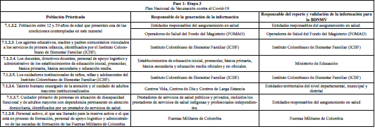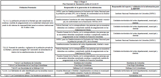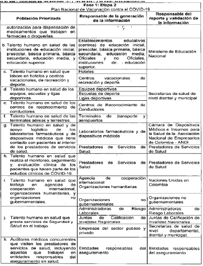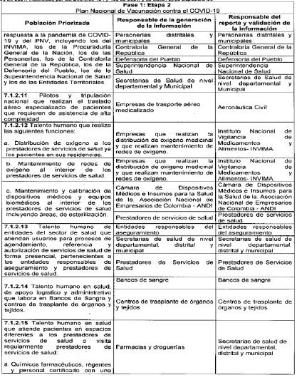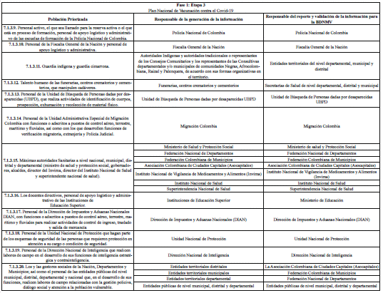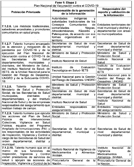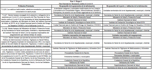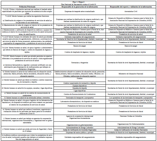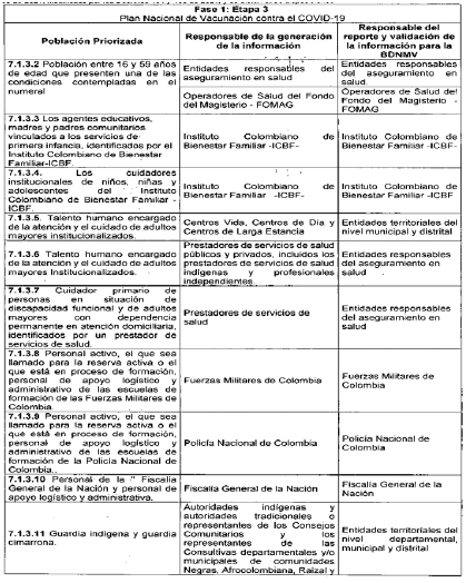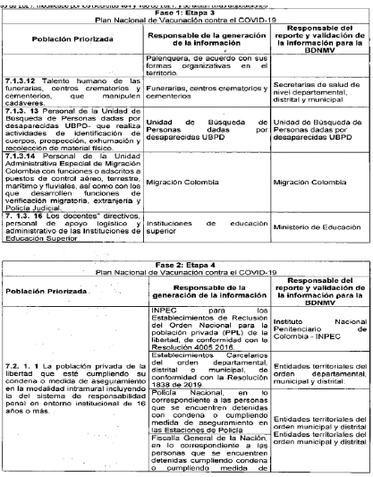ARTÍCULO 3o. RESPONSABLES DE LA GENERACIÓN Y REPORTE DE INFORMACIÓN. A continuación, se establecen los responsables de la generación de información, así como los responsables del reporte de la misma al Ministerio de Salud y Protección Social, de las personas que integran las etapas 2, 3 y 4 de que trata el artículo 7o del Decreto 109 de 2021, modificado por los Decretos 404 y 466 de 2021, discriminado por etapas y grupos poblacionales: