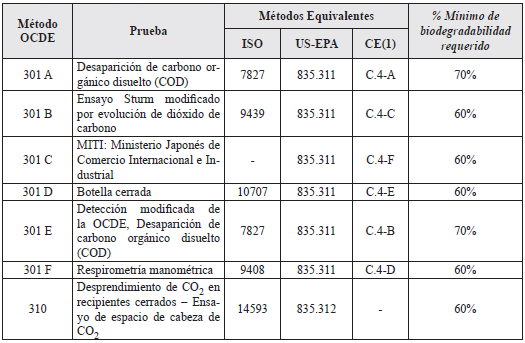 (1) Reglamento (CE) número 440/2008 de la Comisión del 30 de mayo de 2008, sección C4. Nota: Para la realización de cada ensayo se deben revisar las condiciones y aplicabilidad del mismo según el tensoactivo de que se trate. Así mismo, para los ensayos que se realicen sobre el producto es necesario efectuar la extracción de los tensoactivos presentes en el mismo (detergente y jabón), para lo cual se recomienda el proceso establecido en la Especificación Normativa Disponible (EDN) 0065 del 2011 “Biodegradabilidad de ingredientes tensoactivos de detergentes y de otros productos de limpieza. Especificaciones”, relacionado con la extracción etanólica.