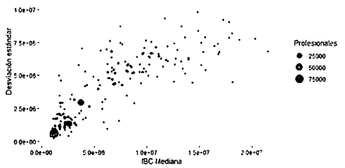 La gráfica 1 muestra la dispersión de la Mediana del IBC por perfil profesional. Se observan dos hechos: i) la dispersión de la Mediana del IBC aumenta cuando aumenta el valor de la Mediana; y ii) el tamaño de los grupos (perfiles) disminuye cuando aumenta el valor de la Mediana del IBC. Se concluye que valores altos de IBC son más sensibles a la presencia de valores extremos (al tener menos observaciones) lo cual disminuye la precisión del IBC Mediano estimado.