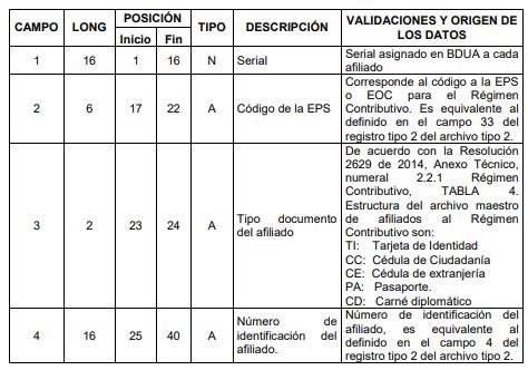 Registro Tipo 2: Corresponde a la información reportada por el aportante por cada uno de sus cotizantes.