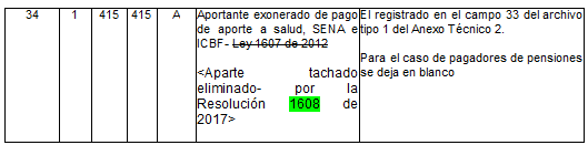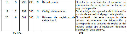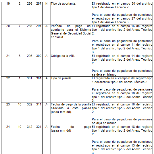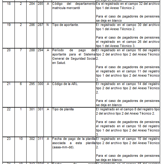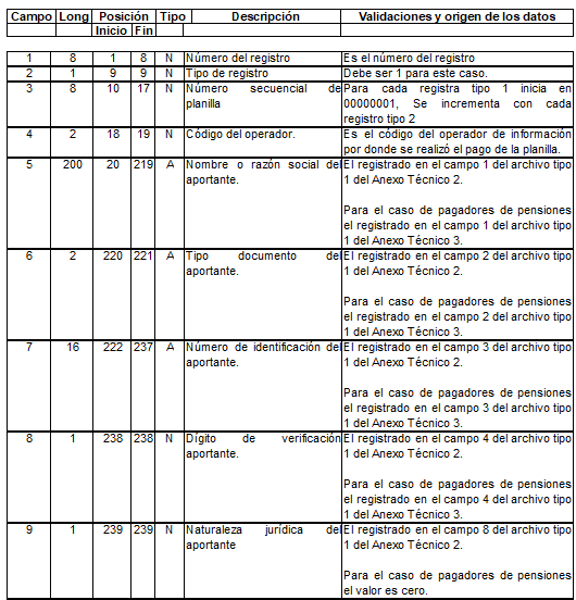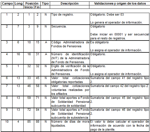 | 3 | 2 | 10 | 11 | N | Código del operador | Para activos es el tomado en el campo 28 del archivo tipo 1 del anexo técnico 2. Para pagadores de pensiones es el tomado en el campo 25 del archivo tipo 1 del anexo técnico 3. |