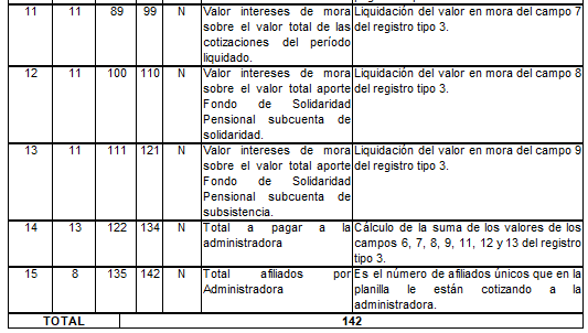 | 11 | 15 | 112 | 126 | N | Total a pagar a ICBF. | Para activos es el tomado en el campo 8 del registro tipo 12 del Anexo Técnico 2. Para pagadores de pensiones se deja en cero (0). |