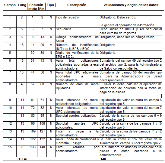 | 7 | 15 | 52 | 66 | N | Total a pagar a salud. | Para activos es el tomado en el campo 4 del registro tipo 12 del Anexo Técnico 2. Para pagadores de pensiones es el tomado en el campo 4 del registro tipo 7 del Anexo Técnico 3. |