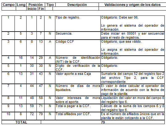 | 6 | 6 | 27 | 32 | A | Código CCF. | Para activos es el tomado en el campo 3 del registro tipo 7 del Anexo Técnico 2. Para pagadores de pensiones es el tomado en el campo 3 del registro tipo 6 del Anexo Técnico 3. |