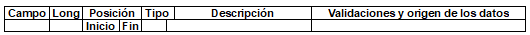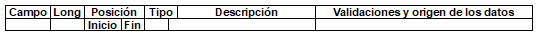 | 1 | 2 | 1 | 2 | N | Tipo de registro. | Obligatorio. Debe ser 11. Lo genera el sistema del operador de información. |