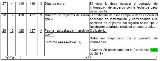 4.5 <Numeral adicionado por el artículo 4 Num. 11 de la Resolución 261 de 2022. El nuevo texto es el siguiente:> La modificación a la longitud de los campos "45 - Días de mora" del numeral 2.1.1 "Estructura de datos del Registro tipo 1. Encabezado del Archivo", "13 - Número de días liquidados en mora" del numeral 2.3.1 "Estructura de datos del registro de salida tipo 3. Total aportes de la planilla para el período de pensiones", "9 - Número de días de mora liquidados" del numeral 2.4.1 "Estructura de datos del registro de salida tipo 4.Total aportes de la planilla para el período al fondo de solidaridad pensional", "10 - Número de días liquidados en mora" del numeral 2.5.1 "Estructura de datos del registro de salida tipo 5. Total aportes de la planilla para el período de salud", "13 - Número de días de mora liquidados" del numeral 2.6.1 "Estructura de datos del registro de salida tipo 6. Total aportes de la planilla para el período a las administradoras de riesgos laborales", "9 - Número de días de mora liquidados" del numeral 2.7.1 "Estructura de datos del registro de salida tipo 7. Total aportes de la planilla para el período a las cajas de compensación familiar", "8 - Número de días de mora liquidados" del numeral 2.8.1 "Estructura de datos del registro de salida tipo 8. Total de aportes del período para el SENA", "8 - Número de días de mora liquidados" del numeral 2.9.1 "Estructura de datos del registro de salida tipo 9. Total aportes de la planilla para el período al ICBF", "8 - Número de días de mora liquidados" del numeral 2.10.1 "Estructura de datos del registro de salida tipo 10. Total de aportes de la planilla para el período a la ESAP" y "8 - Número de días de mora liquidados" del numeral 2.11.1 "Estructura de datos del registro de salida tipo 11. Total aportes de la planilla para el período al Ministerio de Educación.